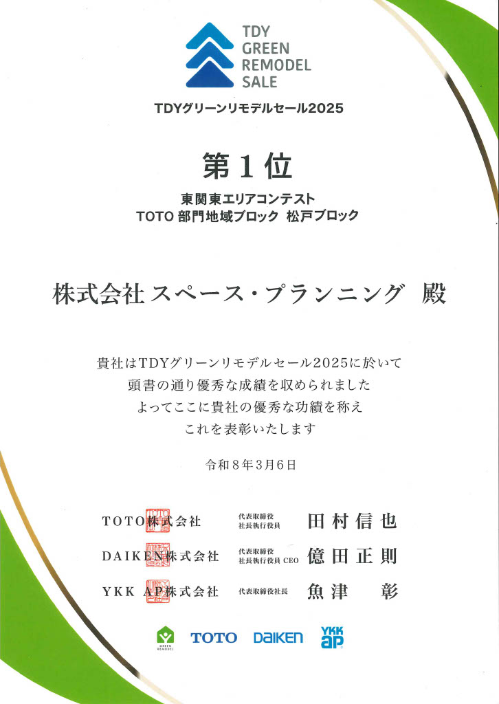 第1位 東関東エリアコンテストTOTO部門地域ブロック松戸ブロックにて表彰されました。